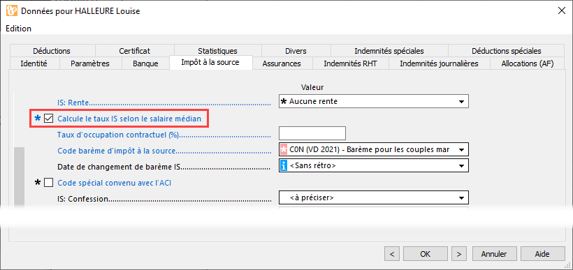 Sélectionnez le mode Calcule le taux IS selon le salaire médian dans l’onglet Impôt à la source des données de l’employé.