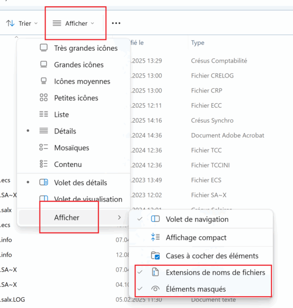 - Dans votre explorateur de fichiers, affichez provisoirement les éléments masqués et les extensions :