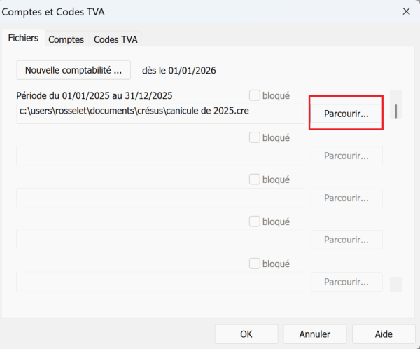 - dans le dialogue qui s’ouvre, cliquez sur Parcourir et sélectionnez le nouveau fichier de comptabilité que vous souhaitez utiliser :