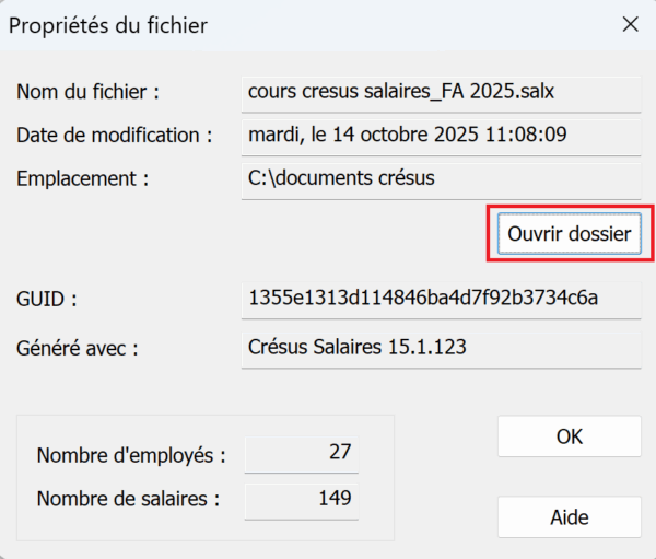 - Ouvrez le dossier où se trouve le fichier de salaires concerné (Fichier > Propriétés > Ouvrir dossier) :