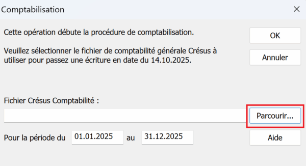 - Lors de votre prochaine comptabilisation depuis votre fichier de salaires, Crésus vous demandera de sélectionner le nouveau fichier de comptabilité cible (comme pour une première comptabilisation) :