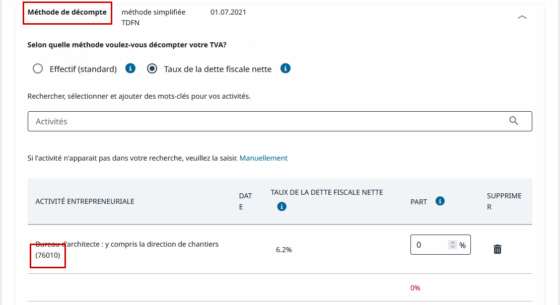 Ouvrez ensuite la section Méthode de décompte qui, une fois dépliée, vous renseigne sur la ou les activités que vous exercez. Associé à chacune de ces activités, vous trouvez un code à 5 chiffres (76010 dans l’exemple ci-dessous) :