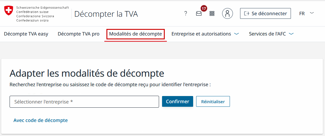 Une fois identifié sur le portail de l’AFC, rendez-vous dans Modalité de décompte. Si vous avez accès à la gestion de plusieurs entreprises, recherchez l’entreprise souhaitée.