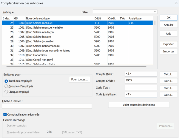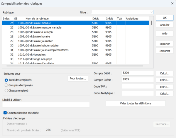 Dans ce dialogue, vous pouvez définir, pour chaque rubrique, les comptes qui devront être imputés dans votre fichier de comptabilité.