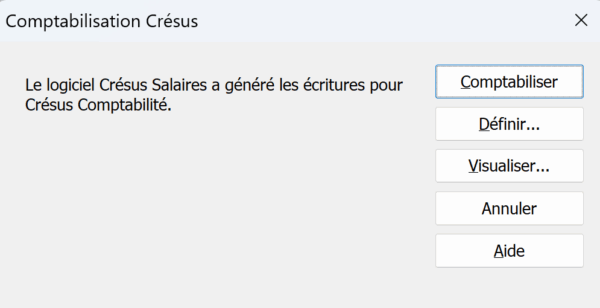 19.4Comptabiliser les salaires sans Crésus Comptabilité Si vous n’utilisez pas Crésus Comptabilité (et que vous travaillez donc en mode non-sécurisé – pour vous en assurer : passez en mode complet > Entreprise > Comptabilisation > case Comptabilisation sécurisée décochée), utilisez simplement la commande Fichier > Comptabiliser ou en cliquant sur l’icône