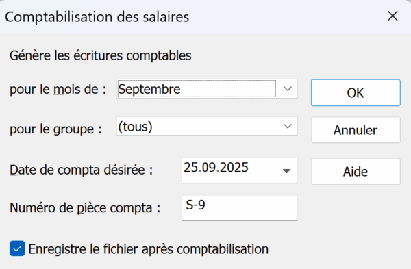 Ce premier dialogue permet de définir la période à comptabiliser (ici : septembre), de sélectionner éventuellement un groupe d’employés en particulier, et de saisir la date de comptabilité souhaitée. Par défaut, Crésus propose, comme numéro de pièce comptable, l’identificateur S- suivi du numéro de la période comptabilisée (ici : 9). Validez avec OK.