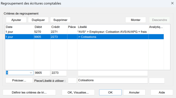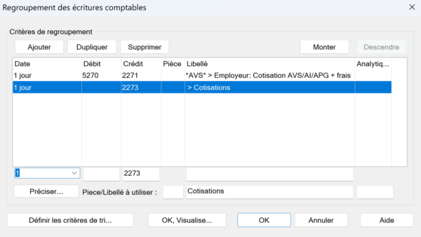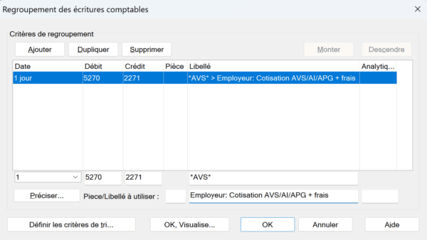 Dans le dialogue de regroupement des écritures, saisissez les numéros de comptes de débit (5270) et de crédit (2271), indiquez que le libellé contient le terme « AVS » (à indiquer entre astérisques), et nommez le libellé de cette nouvelle écriture « Employeur: Cotisation AVS/AI/APG + frais » :
