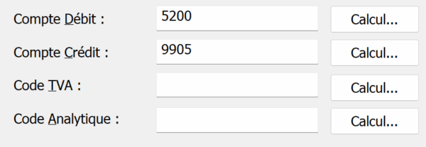 Bien sûr, les comptes et les codes saisis dans ce dialogues doivent exister dans le plan comptable du dossier de comptabilité cible.