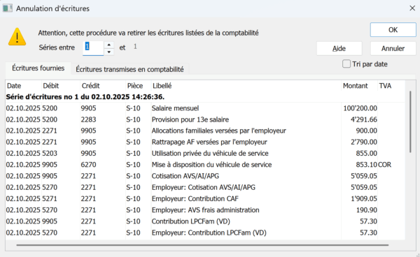 Note : annuler la comptabilisation dans Crésus Salaires ne supprime pas immédiatement les écritures concernées dans Crésus Comptabilité. Pour terminer la procédure, il vous faut à nouveau utiliser la commande Fichier > Comptabiliser dans le fichier de comptabilité cible.