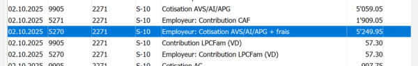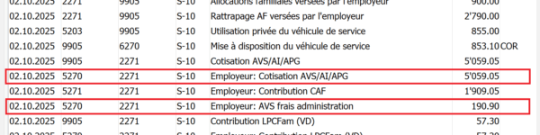 Dans cet exemple, nous souhaitons que les écritures « Employeur: Cotisation AVS/AI/APG » et « Employeur: AVS frais administration » apparaissent sous une même écriture :