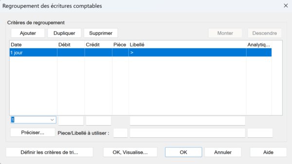 En cliquant sur Définir, vous ouvrez le dialogue de Regroupement des écritures comptables (vous pouvez également y accédez en cliquant sur Visualiser > Groupements) :