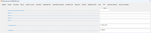 Ce chaînes de substitution sont à saisir sous la forme <1>, <2>, <3>, etc. et correspondent au premier, deuxième, troisième, etc. numéro de compte introduit dans les données de l’employé ou du groupe (onglet Divers > Comptabilité) – il en va de même pour les codes analytiques (onglet Divers > Analytique). Ainsi, Crésus remplacera le <1>, <2>, etc. par l’élément correspondant du champ concerné.
