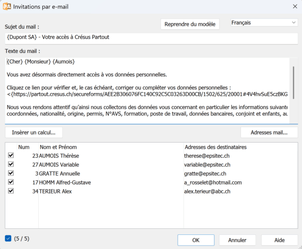 Dans le dialogue qui s’ouvre, l’option Inviter des employés existants à Crésus Partout permet de transmettre à un ou plusieurs employés enregistrés dans le fichier de salaires l’accès à leurs données personnelles.