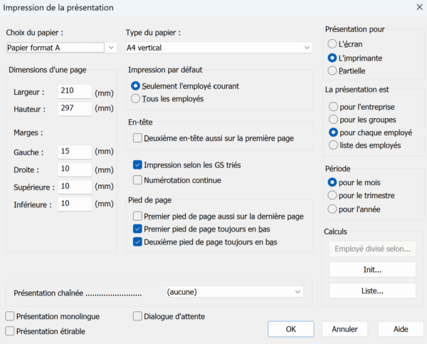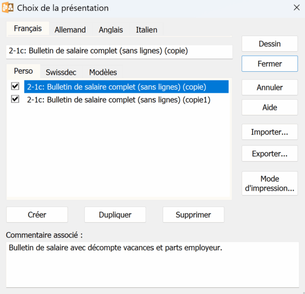 Vous retrouvez ici les mêmes présentations (Perso, Swissdec, Modèles) que celles proposées dans le dialogue d’impression.