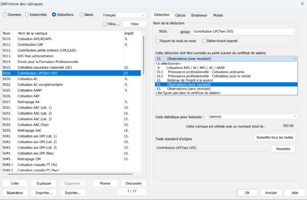 Plusieurs rubriques de Crésus Salaires sont paramétrées pour apparaître par défaut sous ce point. Il est possible d’en supprimer certaines ou d’en ajouter : pour ce faire, passez en mode complet, utilisez la commande Entreprise > Rubriques et (dé)sélectionnez le point 15 dans le champ Cette indemnité/déduction doit être cumulée dans le point suivant du certificat de salaire :