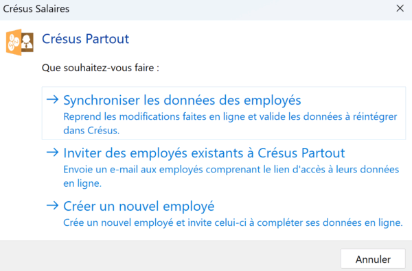 Cliquez sur Synchroniser les données des employés afin que toutes les données saisies dans votre fichier de salaire soient intégrées au serveur Crésus Partout.