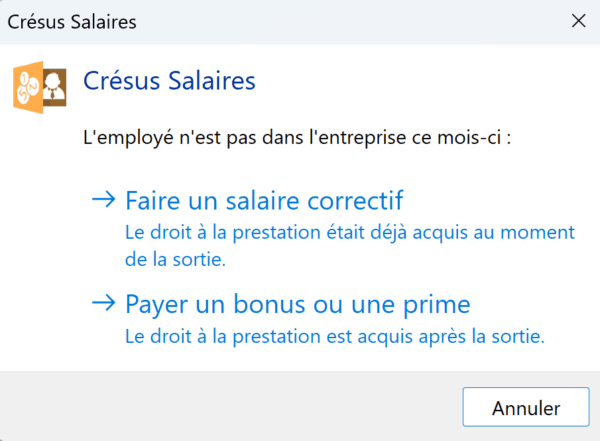 Nous nous efforçons de tenir à jour ce manuel en ligne pour qu’il intègre chaque évolution de Crésus Salaires – que nous développons en continu. Il se peut toutefois qu’il y ait quelques écarts entre certains éléments du manuel (notamment les captures d’écran) et le module que vous utilisez.